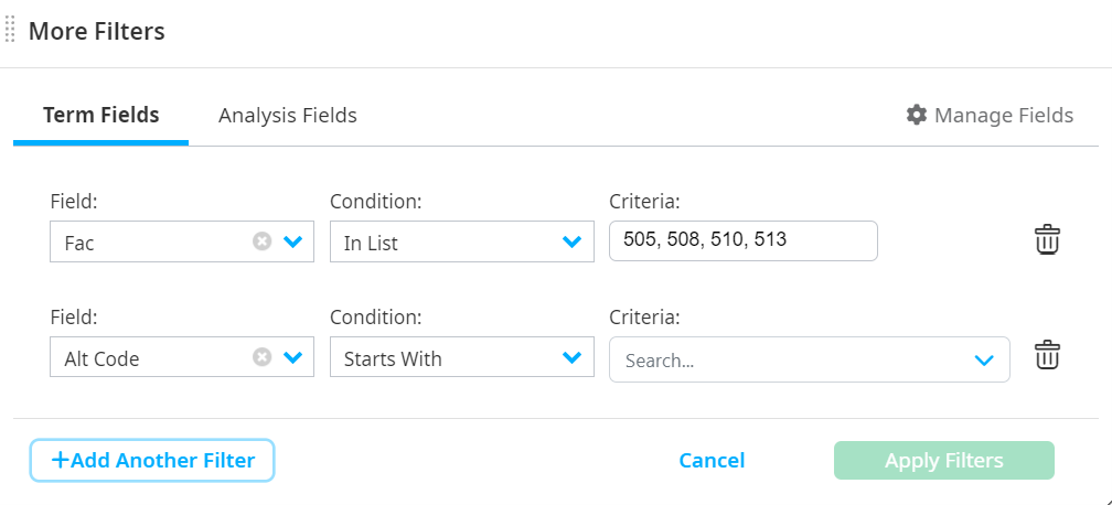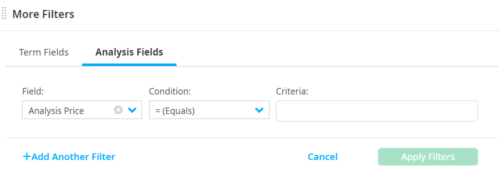 Select the Analysis Fields tab to enter criteria for the Field, Condition, and Criteria dropdowns, if you selected an analysis on the Filters pane.