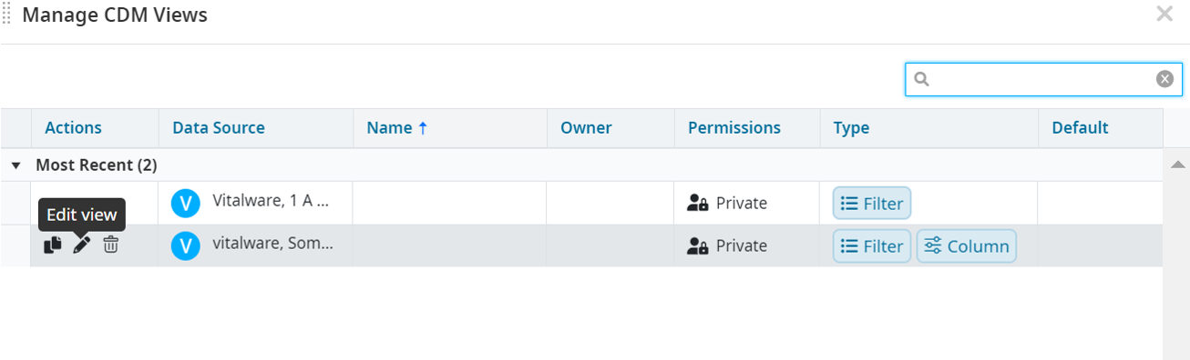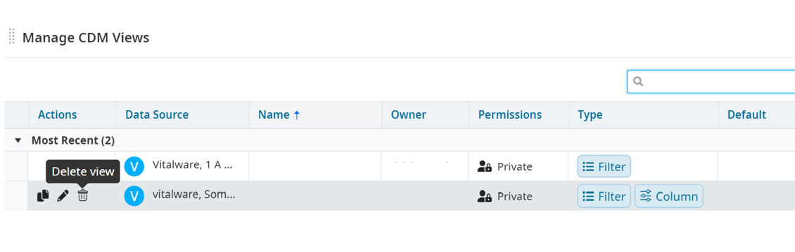 Edit any views you have created on the Manage CDM Views popup. The views you created have your name in the Owner column.