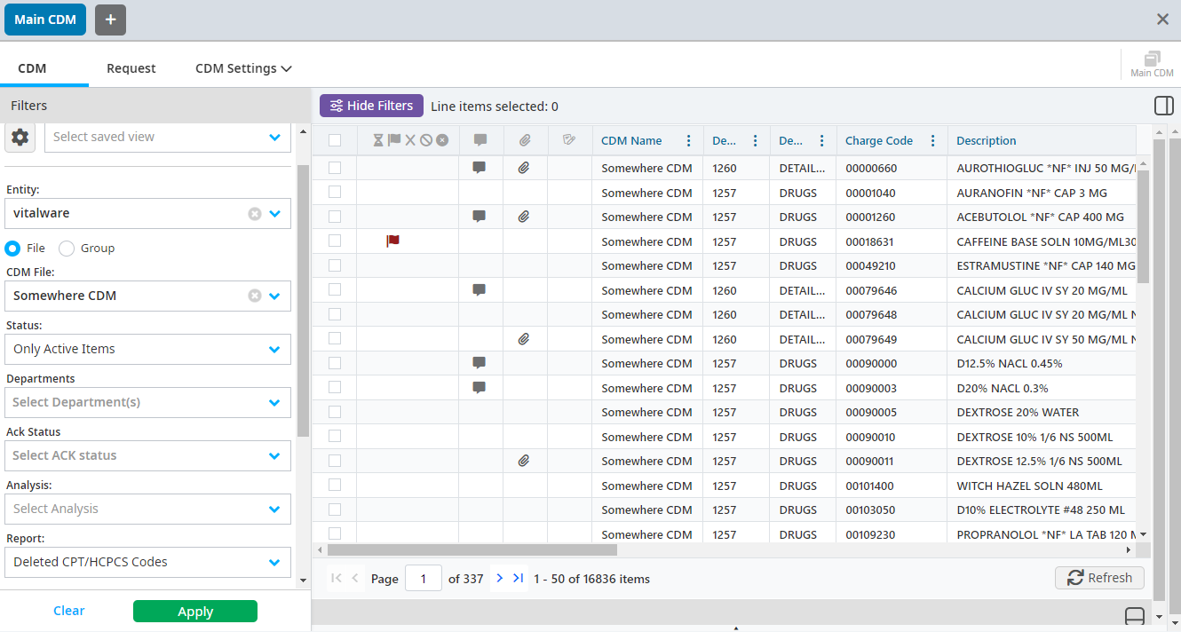 If you have more than one chargemaster file defined in VitalCDM, a default chargemaster can be set to auto-display in the second dropdown selection. Contact your Account Manager if you would like a default to display.