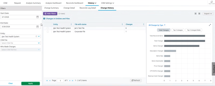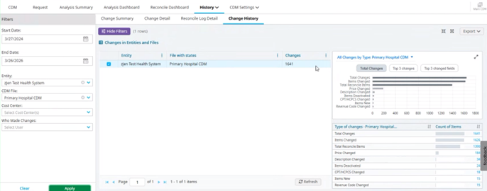 Click Apply. The Results table on the Change History dashboard displays the changes made to the individual CDM file you selected during the data range you entered.