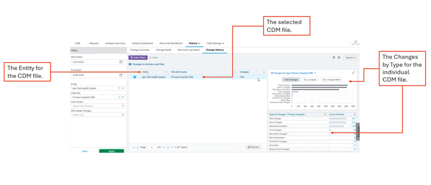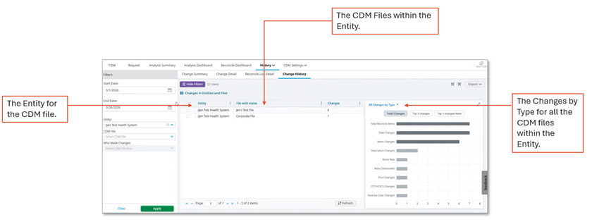 Selecting an individual CDM file to view the change history details for is optional. You are required to select at least an option for the Start Date, End Date, and Entity filters to populate results on the Results table, if you want to view the change history details for entity other than the default entity (based on the entity your user is built in) that is available when you access the Change History Dashboard.