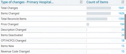 The Types of changes/Count of Items table displays the data from the All Changes by Type graph within a table. This table only displays when viewing the change history details for an individual CDM file.