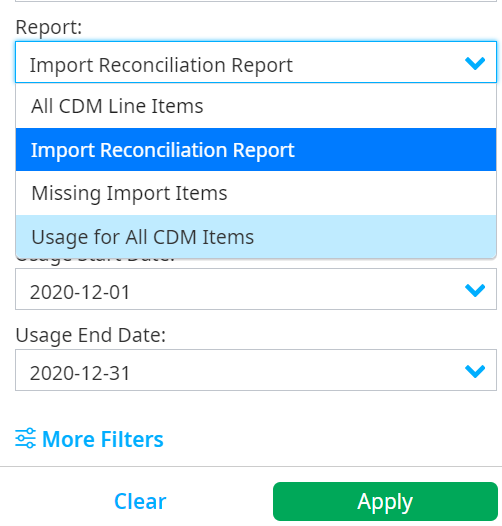 The Import Reconciliation Report also displays under the CDM tab but limits the results to only those items in a state of pending reconciliation.
