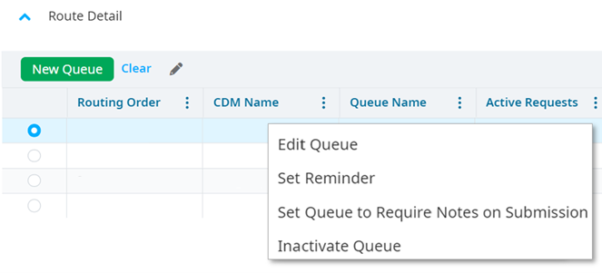 Select the three-dots icon then select Columns to view additional column options. Column titles that are selected are displayed in the Workflow Settings/Route table. Columns that aren’t checked off aren’t displayed.