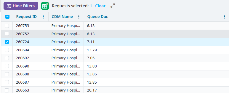 The Queue Duration column displays how long the request spent in each individual queue. In the example below, the request was in the Draft queue for 3.00 days, the CDM Coordinator Sign Off queue for 1.93 days, and the Compliance queue for 3.13 days.
