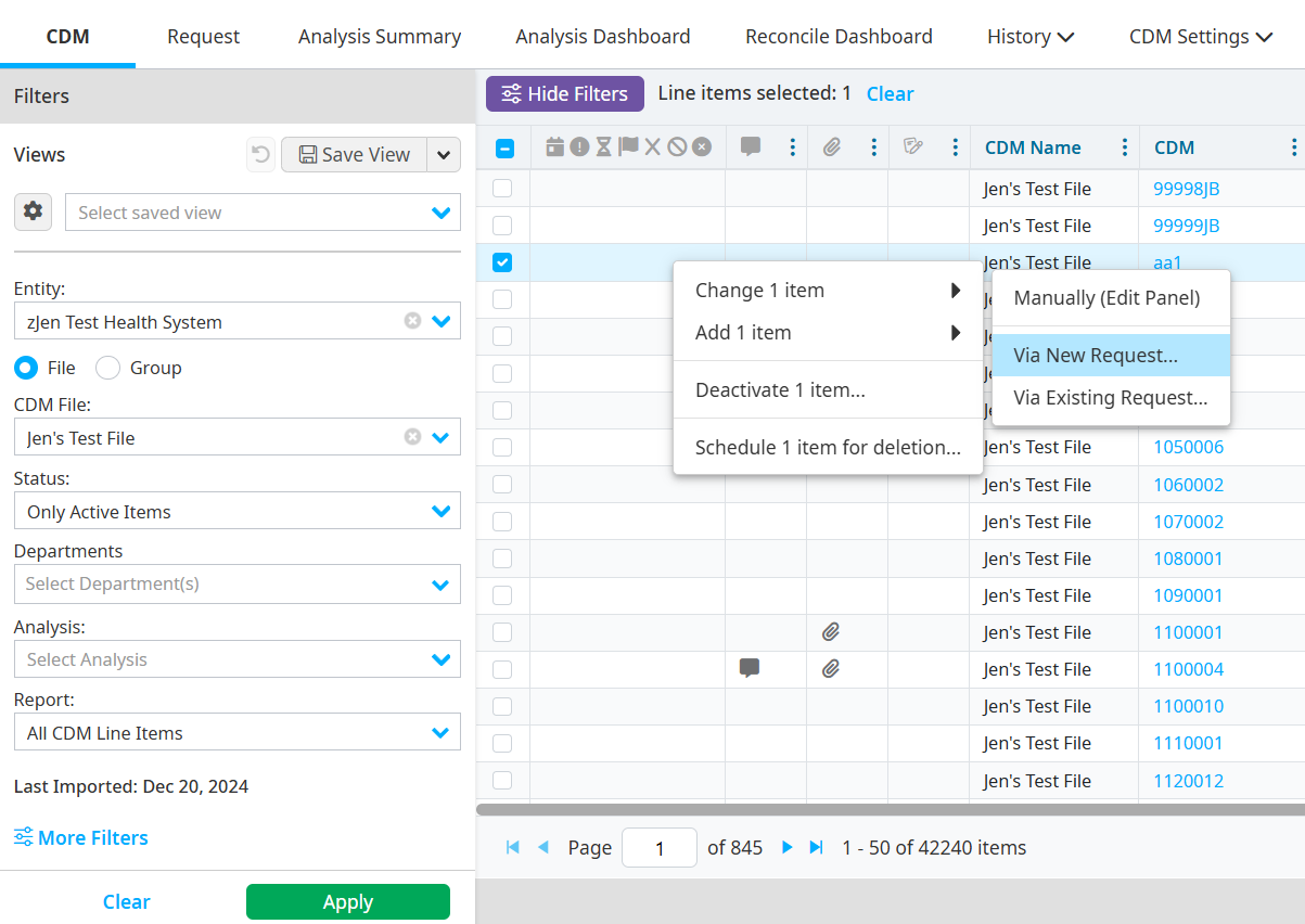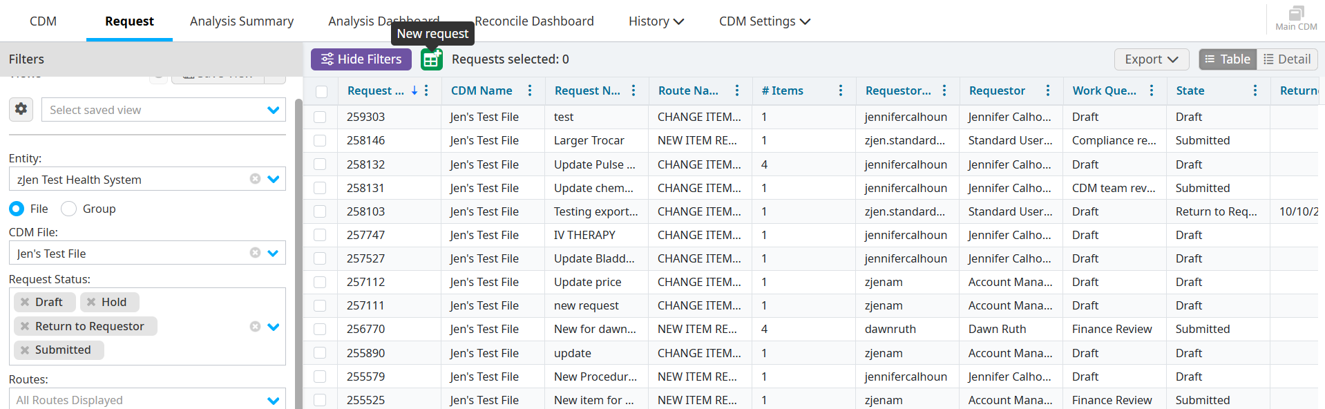 Continue working on the new request, or click the CDM tab to continue reviewing the Results table.