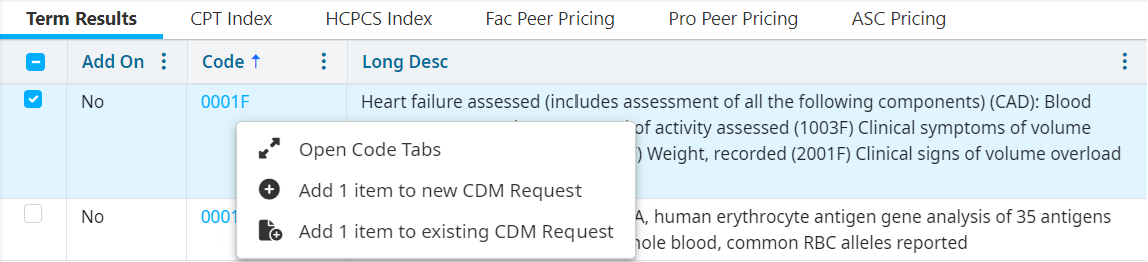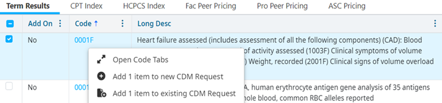 If you are searching CPT/HCPCS, ICD-10 CM, ICD-10 PCS, or Revenue Codes, you can add an item to a new request in VitalCDM from the Term Results tab.