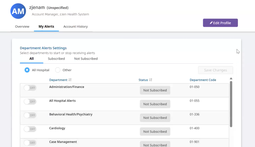 If you're not receiving the VitalAlerts that apply to you, contact your account administrator or your dedicated Vitalware Account Manager. Alerts are broken down into many departments within the Hospital, ASC, DME, Home Health, Lab, Rehabilitation, and Physician setting.