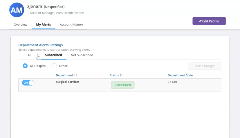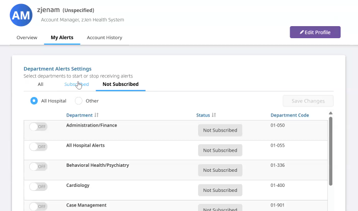 You can view the alerts you're subscribed to in the Subscribed tab, and view the alerts you're not subscribed to in the Not Suscribed tab.