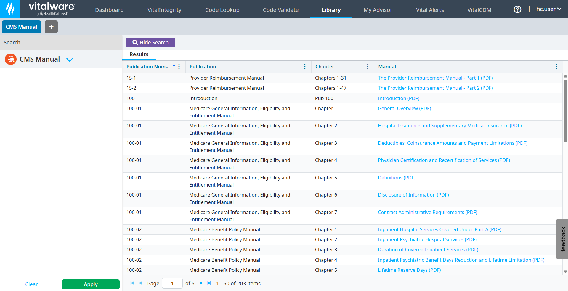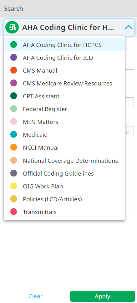The filters differ based on document type. Each document includes a link that opens the document directly from the source.